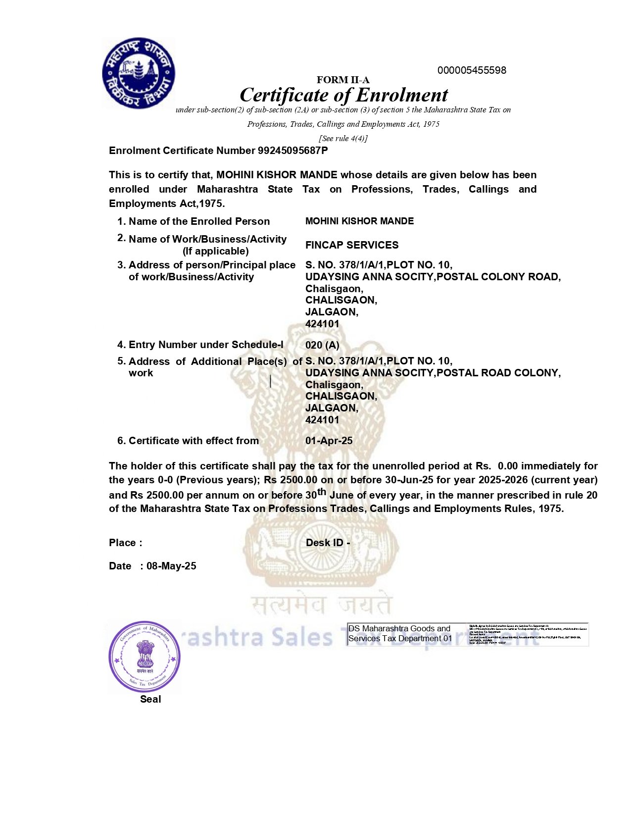 Fincap Services is a client-focused financial services firm based in Chalisgaon, Maharashtra, dedicated to investor awareness, education, and ethical facilitation of financial products. We operate as an Authorized Channel Partner (Authorized Person) of Angel One Limited, a SEBI-registered stockbroker, and support clients with Demat and trading account opening and permitted services—strictly in line with regulatory and compliance guidelines. With a strong emphasis on transparency and trust, we have supported 13,000+ satisfied clients while promoting responsible investing and financial literacy.